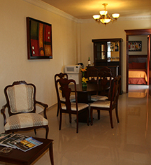 Perfect for family and group travelers, the Master Suite affords space for everyone to feel comfortable during time in Merida, with space for up to six visitors. Well-appointed furnishings rest within the master bedroom and living room spaces, with a dining room area, as well. Two bedrooms are featured, one with a king-sized bed, and the other with two double beds for added comfort and customizable configurations.