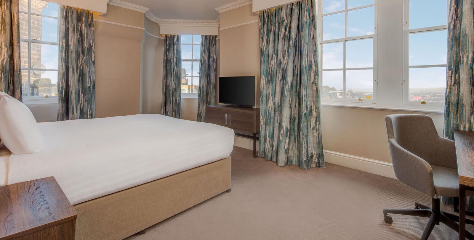 When Amaris Hospitality and Hilton Worldwide thoroughly renovated the Hilton Edinburgh Carlton, the two placed an emphasis on restoring both its historic elegance as well as its extravagant appeal. They refurbished every one of the hotel’s 211 guestrooms and suites to provide the foremost in modern relaxation. Standard rooms now feature fabulous amenities such as premium Serta bedding, high-definition flat-screen televisions, and complimentary WiFi.