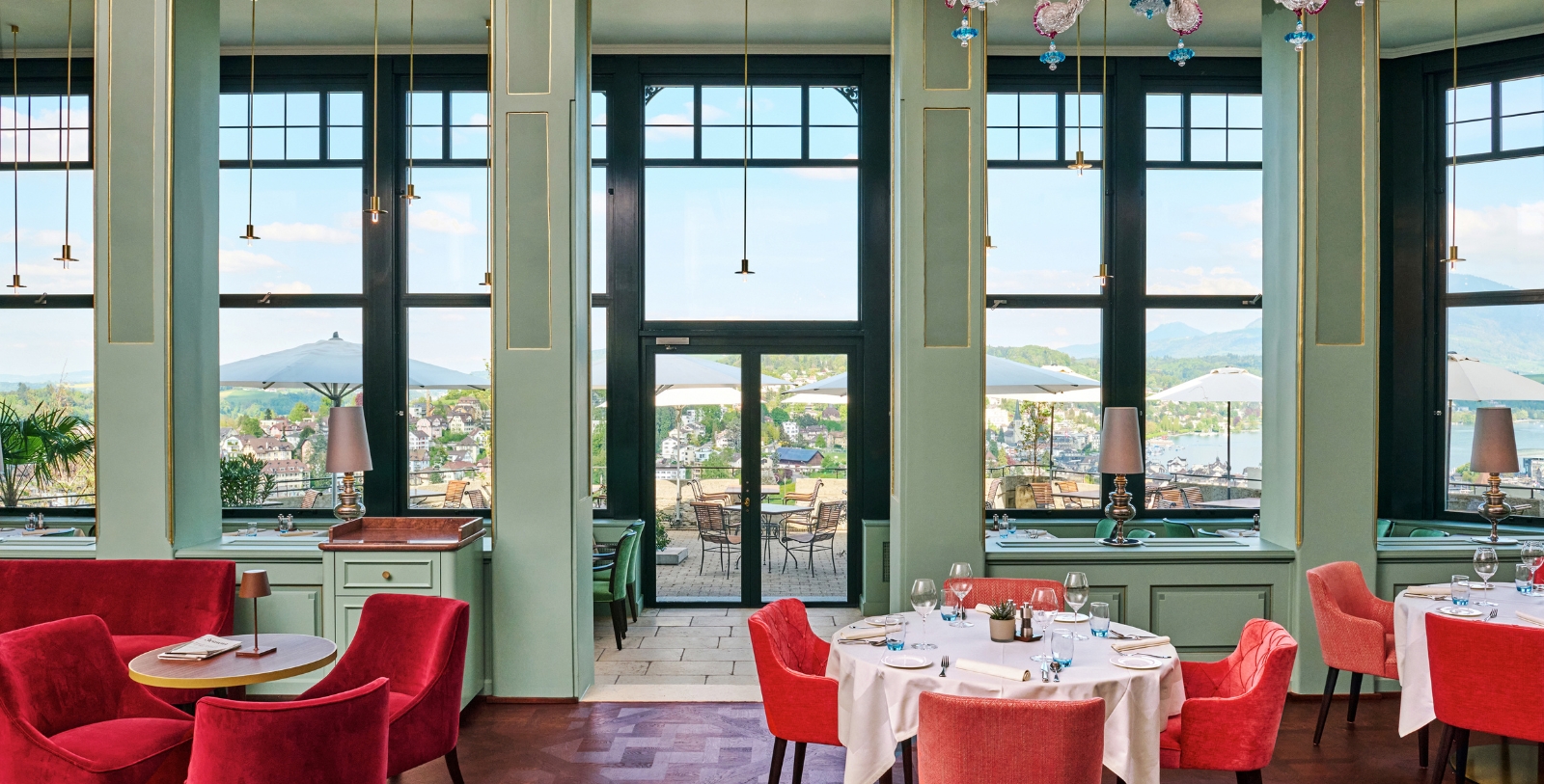 The hotel's restaurant and bar combine stunning views, elegant ambiance, delicious food, and beverages to give diners the ideal experience. Restaurant Lumières, named for the dramatic city lights visible from the veranda, features gourmet Swiss and Mediterranean dishes made with fresh, seasonal ingredients. Parties can enjoy a traditional fondue chinoise in the gallery, and all diners can pair their meals with wine selections from the Castle Cellar. The American Bar, a Lucerne institution, features both classic and innovative cocktails. Guests can sip and socialize on the terrace and in the courtyard, weather permitting.