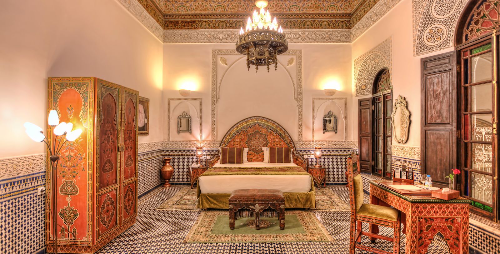 Sleep soundly in the palace at Riad El Amine Fès. Each room and suite reflect the Fassi House with canopied beds, intricate architectural detail, and grand chandeliers that will take guests back in time to the tale of Arabian Nights. Enjoy a stay of relaxation and luxury at Riad El Amine Fès.