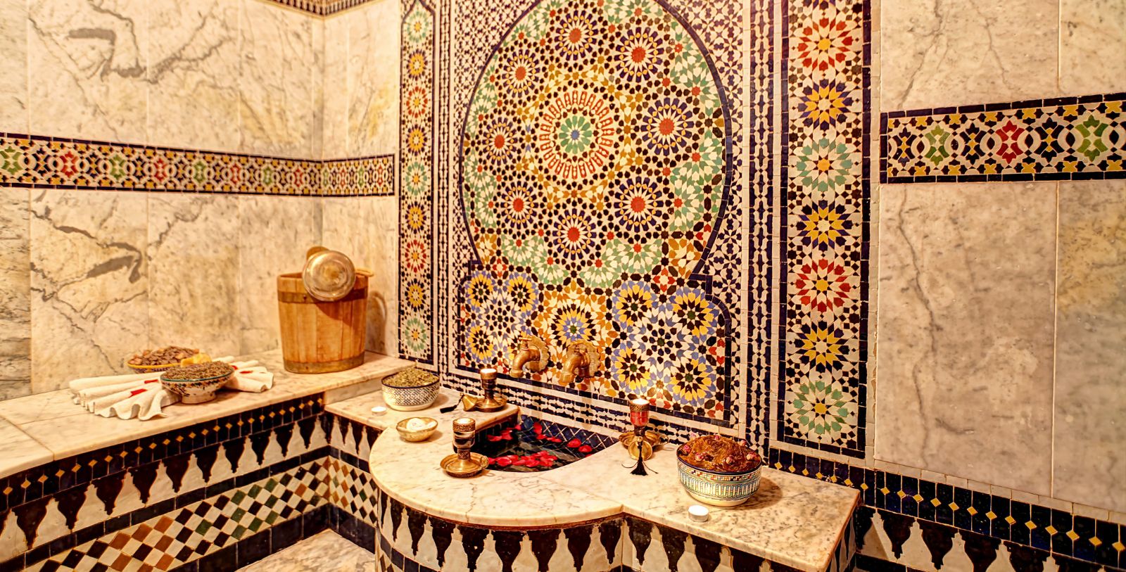 Enjoy a special spa treatment at Riad El Amine Fès. A Hammam Ritual is offered at the hotel that allows guests to experience an authentic Middle Eastern steam bath. This practice is common throughout the Middle East, and it is a cleansing of the body with black soap, made from olive oil and crushed olives. It is then followed by a body scrub with a special-made coarse cloth that removes dead skin. A body wrap with rich mineral clay is the last step before washing off and having radiant and soft skin. The benefits of this bath help relieve stress and tension, boost the immune system, and rejuvenate the skin making it clear and smooth.