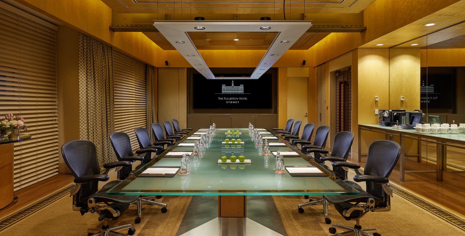 Heritage Executive Boardroom: Outfitted with the latest audiovisual technology and equipment, the 76-square-meter Heritage Executive Boardroom is a contemporary setting for meetings of up to 20 people. Amenities include a 100-inch 4k UHD Display Monitor and features a private bathroom and a connecting door to the other meeting rooms.
