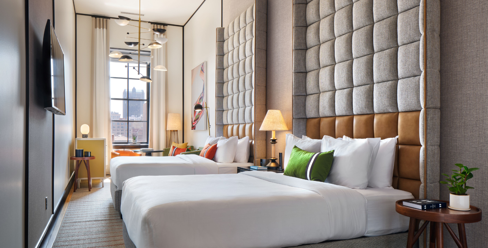 The Luxury Double Queen guestrooms come outfitted with two queen-size beds, seating area with a table and bath tub, plus all 21c luxury amenities.