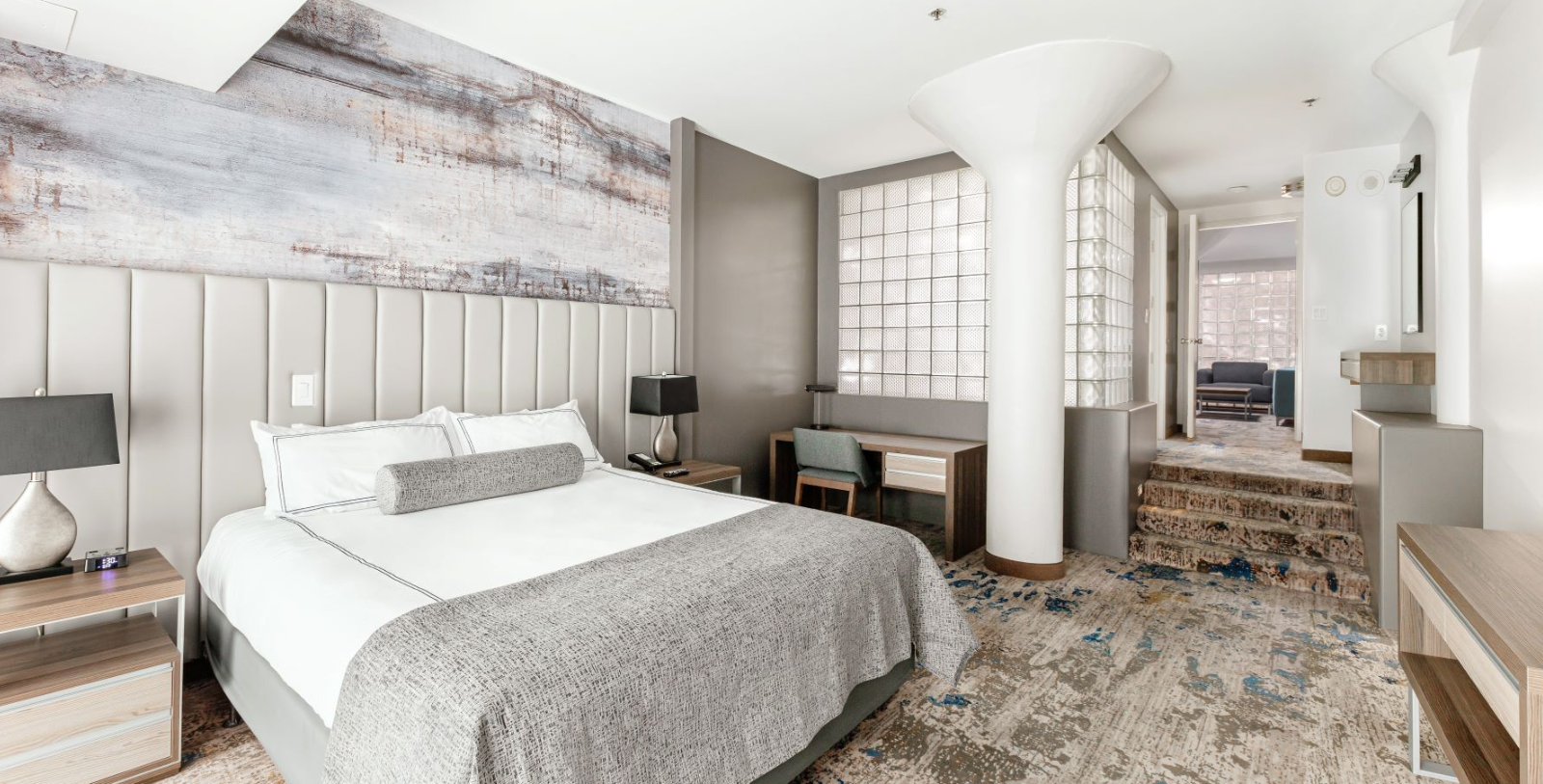Governor Suite: The Governor Suite offers 1,000 square feet of living space split between a living room and sleeping room. The living room includes a wet bar and high ceilings with stunning skyline view. The sleeping area includes a king-size bed with marble whirlpool bath.