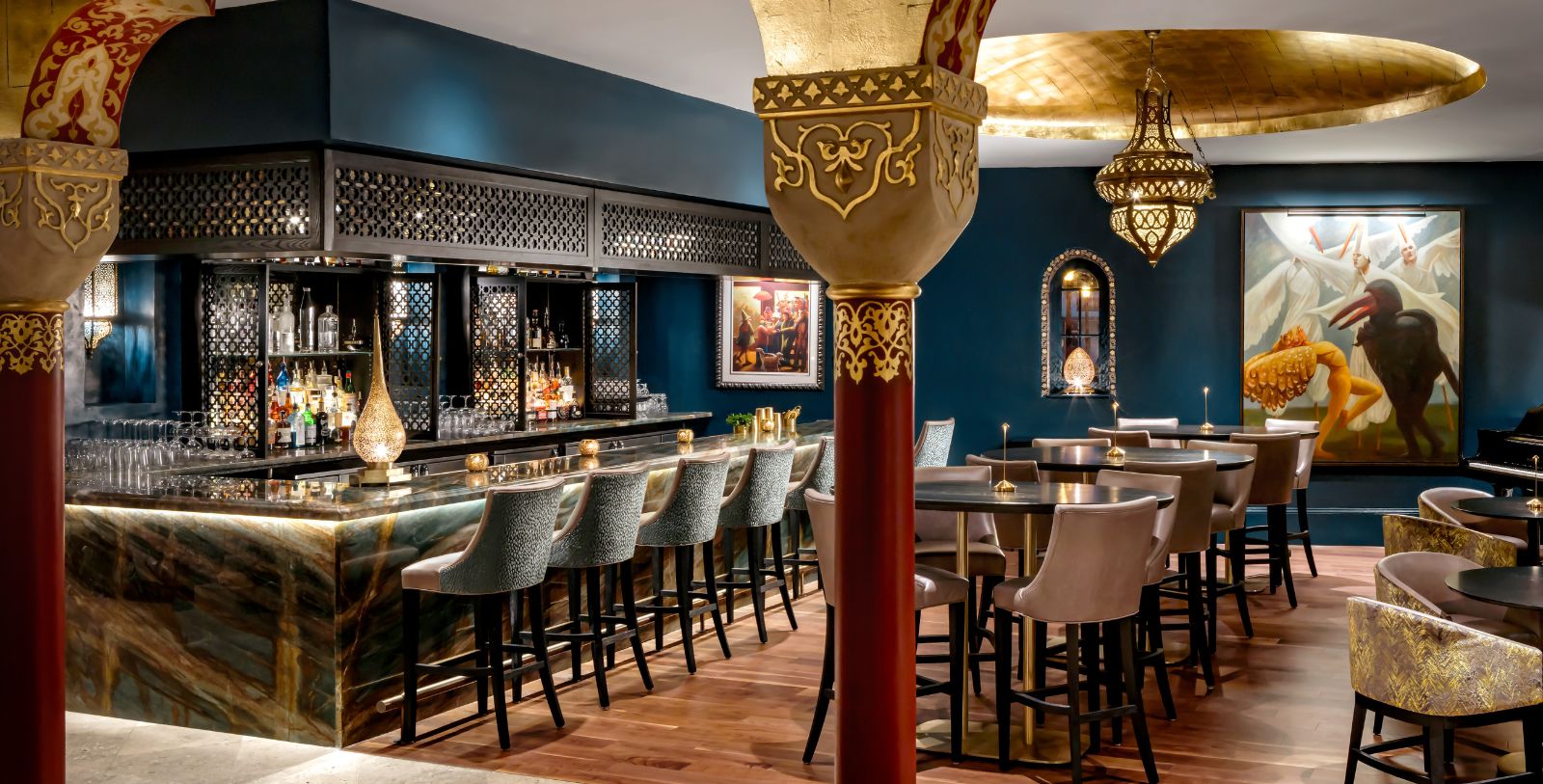 Guests dine in one of three different jewel-toned rooms filled with luxuriously appointed furnishings and upholstered banquettes. Hand-selected antiques and artisan-crafted chandeliers from the Mediterranean lend exotic nuance to the decor. In the Sultan's Room, lush palms, draped silk fabrics, and mosaic artwork transport diners to another world. The Cobalt Lounge is equally elegant, offering cocktails, appetizers and a delightful array of desserts. The on-site Starbucks® offers delicious freshly-baked goods.