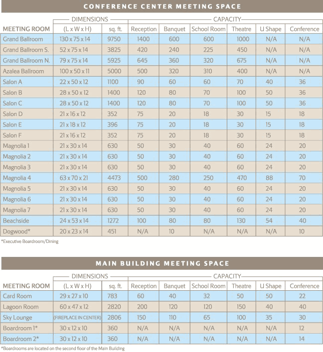 With space ranging from ballrooms to smaller spaces, guests have a choice of space located both indoors and outdoors. Outdoor space includes the beachfront patio. Each venue comes standard with a projector, microphone, stage, television, audio-visual equipment, video camera, catering services, and more.