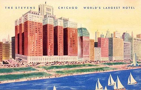 In 1945, the great hotelier Conrad Hilton purchased both The Stevens Hotel and renamed it as “The Conrad Hilton Hotel” shortly thereafter. Hilton immediately began to thoroughly transform the structure back into a luxurious hotel through a series of extensive renovations. Perhaps the most innovative of all his improvements was the installation of a large ice stage in the Boulevard Room Supper Club. By the 1960s, The Conrad Hilton Hotel even sported new facilities like the International Ballroom, the Continental Ballroom, and 53,000 square feet of additional exhibition space. Then, in 1984, the original Rooftop Ballroom was converted into the massive Conrad Hilton Suite. It cost $1.6 million to construct and boasted 5,000 total square feet spread out over two levels—the 29th and 30th. Overlooking Grant Park and Lake Michigan, the suite contained a grand salon, dining room (for 14 people), private kitchen, three gorgeous bedrooms, and a library with pool table and bar! There was even a private helipad installed on the roof! The suite was President Bill Clinton’s favorite place to stay in Chicago, as he loved the pool table during his visits to the hotel. Several films and television shows also featured The Conrad Suite, including The Fugitive, Home Alone 2, and E.R.