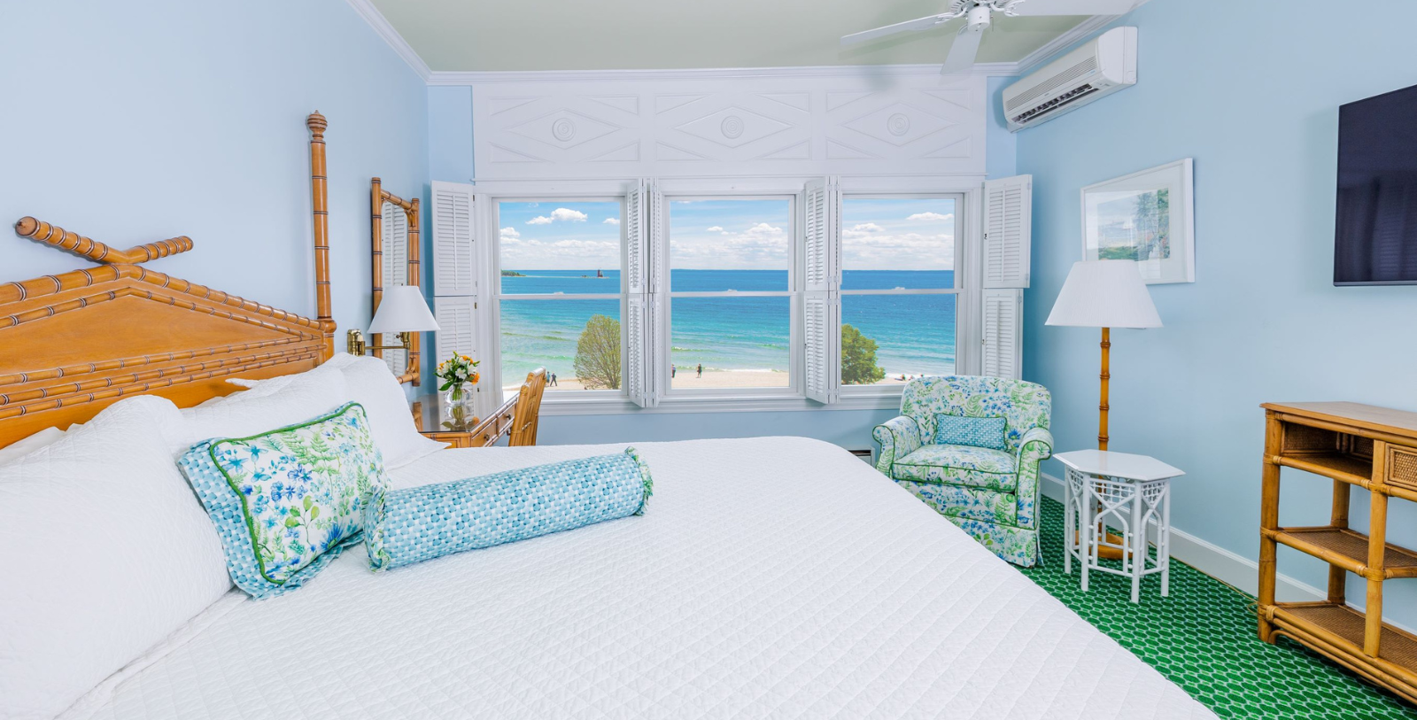 Waterfront Deluxe Rooms are spacious guestrooms designed with vibrant colors that show off a cozy coastal atmosphere. The waterfront deluxe rooms are the Marina View Deluxe King, Waterfront Deluxe King, Waterfront Deluxe King with Balcony and Waterfront Deluxe Queen. These rooms are located throughout the second and third floors and offer exquisite views of the Straits of Mackinac.
