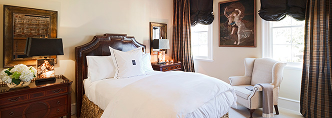Located at the heart of the gardens, the Carriage House cottage is divided into two nearly identical rooms. Carriage House East is an ADA-compliant standard guestroom and West is a standard guestroom; both feature a king-sized bed, gas fireplace, wet bar and access to a wide front porch that sweeps the front façade of the cottage and is shared by both rooms. Carriage House East features a spa-style bath with a handicap-accessible tumbled Travertine-tile walk-in shower with a full-body spray wand. Carriage House West features a spa-style bath with a glass-enclosed tumbled Travertine-tile walk-in shower with a large, separate soaking tub.
