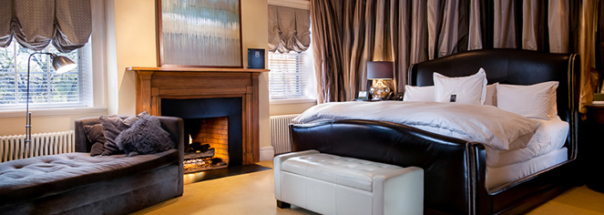The iconic Master Suite is a picture of elegance. Located on the second floor of the Manor House, guests open the door to a stylish and comfortable sitting room with private access to the entire second-story porch that spans the front façade of the Manor House. This extensive suite includes an immense bedroom with a king-size bed surrounded by lush, sumptuous custom fabric drapery, and a gas fireplace at its center. The spa-style bath features a glass-enclosed Carrera marble tile walk-in shower with a rainfall shower head, a large soaking tub, a custom vanity with a lit-from-within mirror, and a heated Carrera marble tile floor and heated towel rack. The central location, expansive size, and striking elegance of this suite makes it the ideal accommodation for a Bride and Groom, and the dramatic, sweeping views of the property from the private porch offer a picture-perfect photo opportunity for a couple celebrating a special romantic moment.