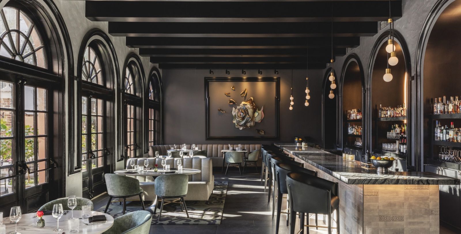 Walking along the cobblestone streets of Charleston, visitors may notice hidden gardens secluded away behind wrought iron railings blanketed with cascades of flowers, oasis-like remnants of the Victorian era. Iron Rose pays homage to these urban Edens, as well as the generations of skilled blacksmiths who forged the ornate metal gates that envelop them. Here, diners can indulge in a succulent spread of elevated, Southern-inspired fare while taking in the moody, dark interior and graceful floral accents of the dining room or enjoying the tinkling fountain and glowing bistro lights of the courtyard. Open for breakfast, weekend brunch, lunch, and dinner, this signature eatery specializes in the coastal cuisine of the Lowcountry, with dishes like pimento cheese, crispy chicken thighs brined in sweet tea and served with hot honey and peach compote, blue crab fritters, and local shrimp with house-made andouille sausage.