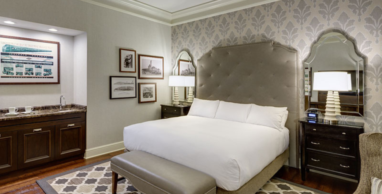 Guests of the Station Suite can enjoy spacious accommodations with added amenities, including a small wet bar area, refrigerator, bottled water, and plush bathrobes. Located within the Union Station historic Grand Hall Headhouse, this two-room suite boasts an elegantly decorated parlor area with a 37-inch television, king-size bed, and wireless Internet access. This suite also comes with two full bathrooms and a sofa bed.