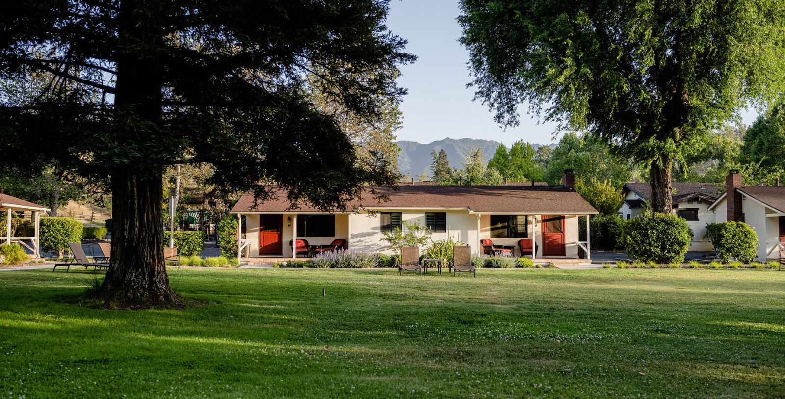 Sycamore House—named after the large Sycamore trees that surround the house and line the entrance onto Alisal Ranch—features two luxury king studio rooms that adjoin a luxurious living room (“Alisal” is the Chumash word for “sycamore grove,” and the tree is a large part of ranch identity). Each studio features a wood-burning fireplace and a private bathroom. The shared living room is accented by reclaimed barn-wood paneling and a wood-burning fireplace. Throughout the house, vintage artwork and furniture, as well as Pendleton accessories, create a cozy atmosphere.