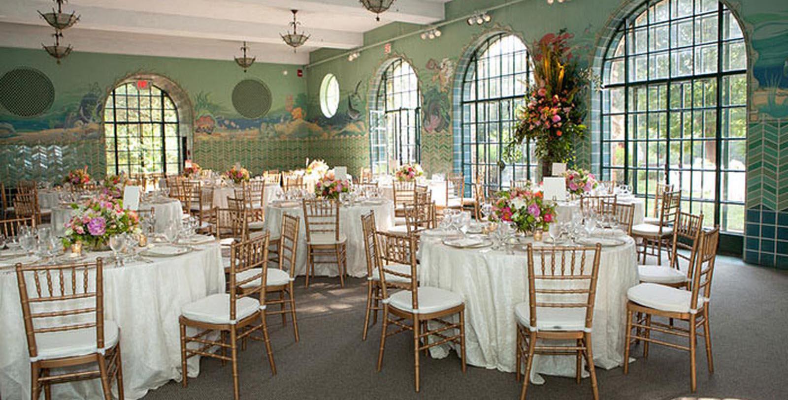 Formerly home to the estate's indoor pool, the Atlantis Room is a whimsically opulent space for a wedding reception, featuring sea glass-hued tiles, grand arched windows, and charming oceanic designs.
